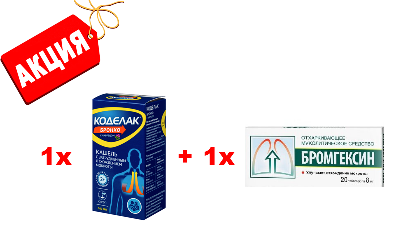 1уп. Коделак Бронхо с чабрецом эликсир (срок 01.08.2026) +1уп. Бромгексин таб. 8мг N20 (срок 01.05.27) в подарок, акция до 31.03.2026