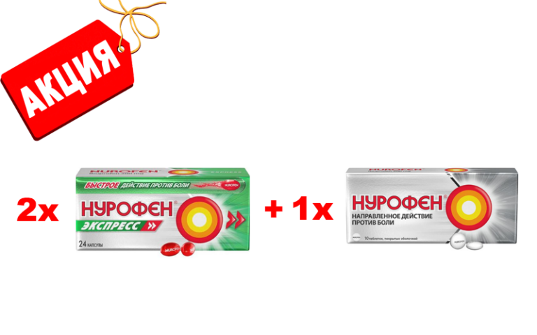 2уп. Нурофен Экспресс капс. 200мг №24 (срок 01.05.2028) +1уп. Нурофен таб. п/о 200мг №10 (срок 01.12.2026) в подарок, акция до 31.03.2026