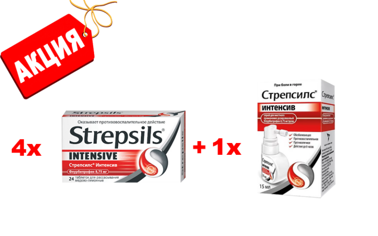 4уп. Стрепсилс Интенсив таб. д/рассас. 8,75мг №24 Мед и Лимон (срок 01.02.2028) +1уп. Стрепсилс Интенсив спрей 8,75мг/доза 15мл (срок 01.01.2027) в подарок, акция до 31.03.2026