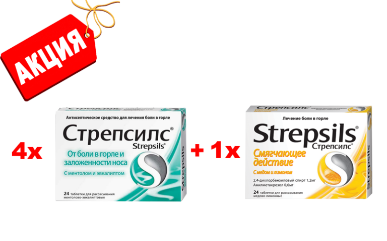 4уп. Стрепсилс таб. д/рассас. №24 Ментол и Эвкалипт (срок 01.12.2027) +1уп. Стрепсилс таб. д/рассас. №24 Мед и Лимон (срок 01.05.2028) в подарок, акция до 31.03.2026