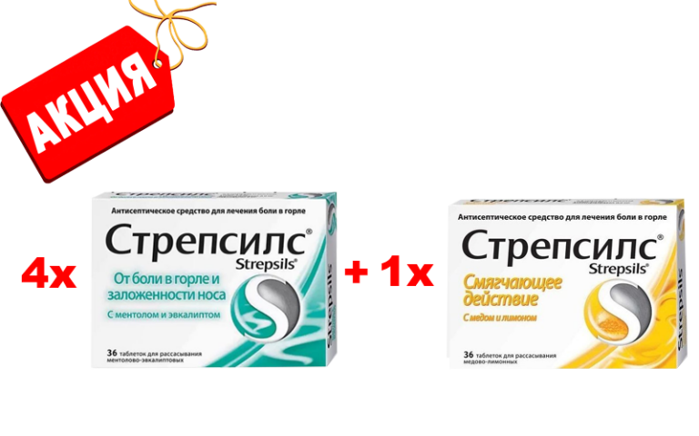 4уп. Стрепсилс таб. д/рассас. №36 Ментол и Эвкалипт (срок 01.09.2027) +1уп. Стрепсилс таб. д/рассас. №36 Мед и Лимон (срок 01.03.2028) в подарок, акция до 31.03.2026