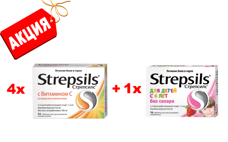 4уп. Стрепсилс с Витамином С таб. д/рассас. №24 Апельсин (срок 01.09.2027) +1уп. Стрепсилс д/детей таб. д/рассас. №16 Клубника (срок 01.07.2027) в подарок, акция до 31.03.2026