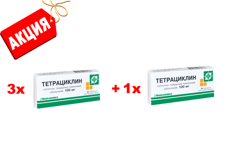 3уп. Тетрациклин таб. п/о 100мг №20 (срок 30.04.2028) +1уп. Тетрациклин таб. п/о 100мг №20 (срок 30.04.2028) в подарок, акция до 31.03.2026